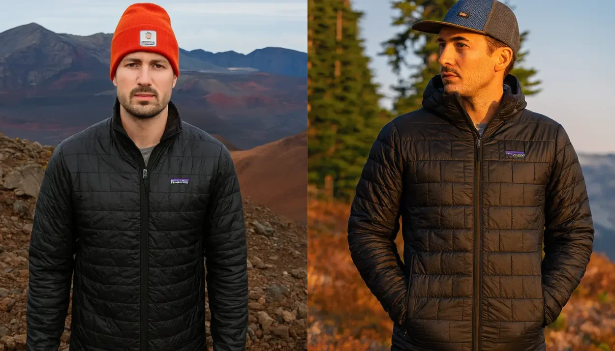 I’m putting the Patagonia Nano Puff Jacket against the Patagonia Down Sweater, same size, non-hooded, used on the same trails. The Nano Puff runs 60 g PrimaLoft Gold Eco in a 20D ripstop shell and stuffs into its own pocket.