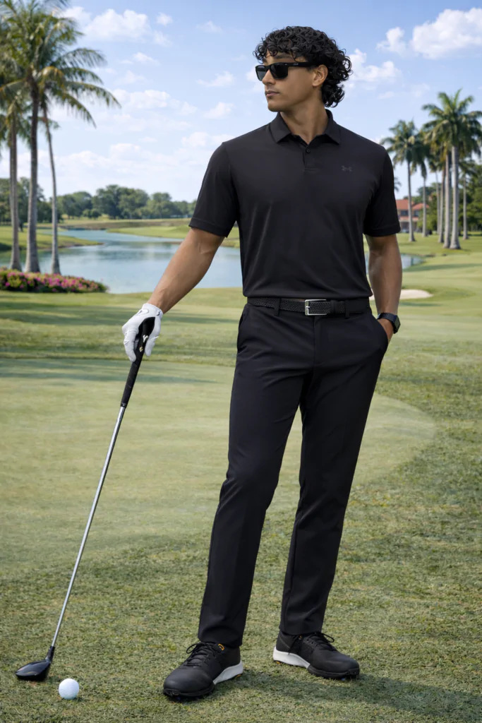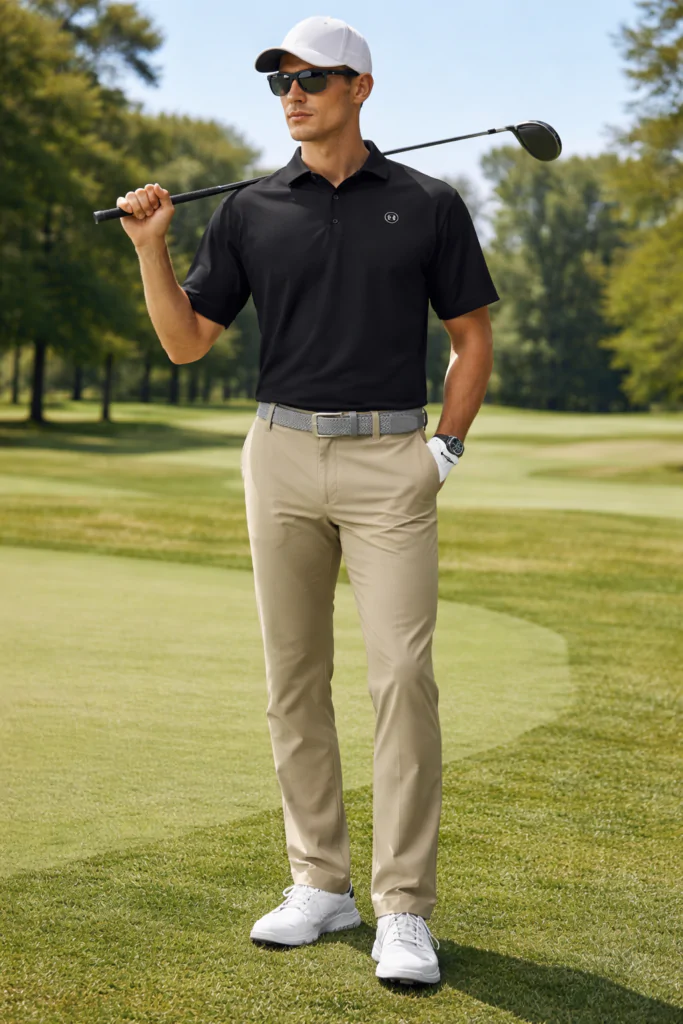 • Black performance polo – lightweight, moisture-wicking, and built for full swing mobility.